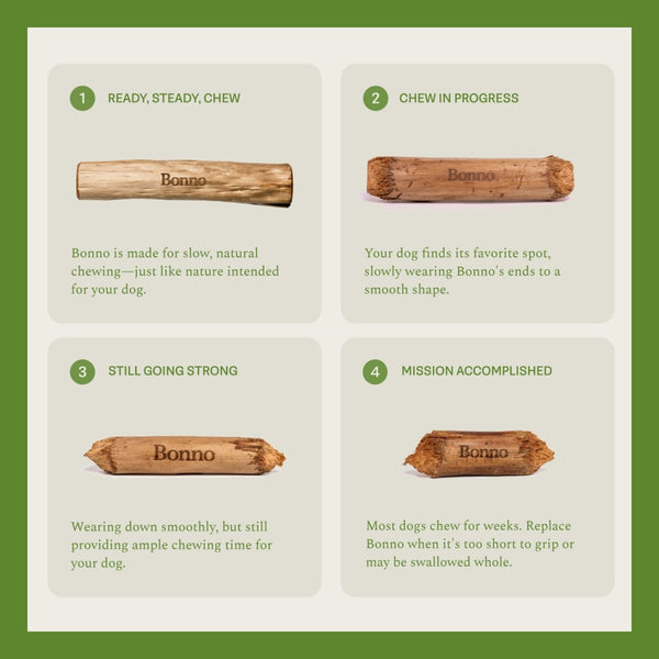Dogs love to chew—it strengthens their jaws, supports dental health, and naturally calms them. Chewing releases feel-good chemicals like dopamine and endorphins, satisfying a dog’s natural instinct. Bonno is the perfect, natural chew toy to keep your dog happy and healthy!