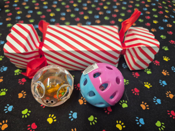 Christmas for your kitty cat is sorted with these crackers. Includes 1 x soccer bell ball and 1 x mouse rattle ball.