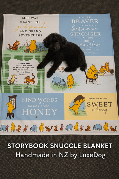 This LuxeDog Bear and friends snuggle blanket is handmade in New Zealand using a premium story-panel cootn front paired with a soft fleece baking - the perfect mix of cosy, stylish and durable.