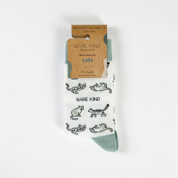 These paw-esome cat socks are luxuriously soft, comfortable and high-quality white & green socks made from breathable bamboo fibre that feature cats all over.