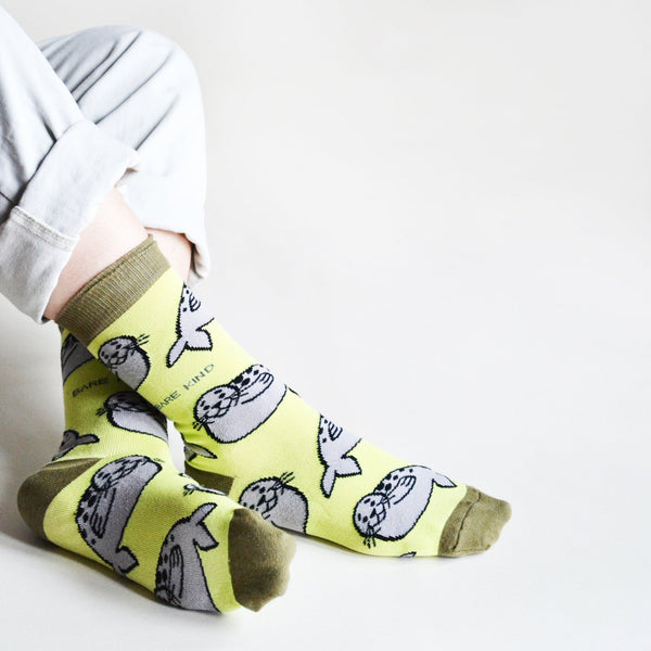 These Seal Socks are hard-wearing, soft, green socks made from plush bamboo fibre that feature animated seals all around. Seals are actually distant relatives of bears and skunks, but not manatees. They come in various shapes and sizes and all of them have ears. Yes, even the earless seals have ears.